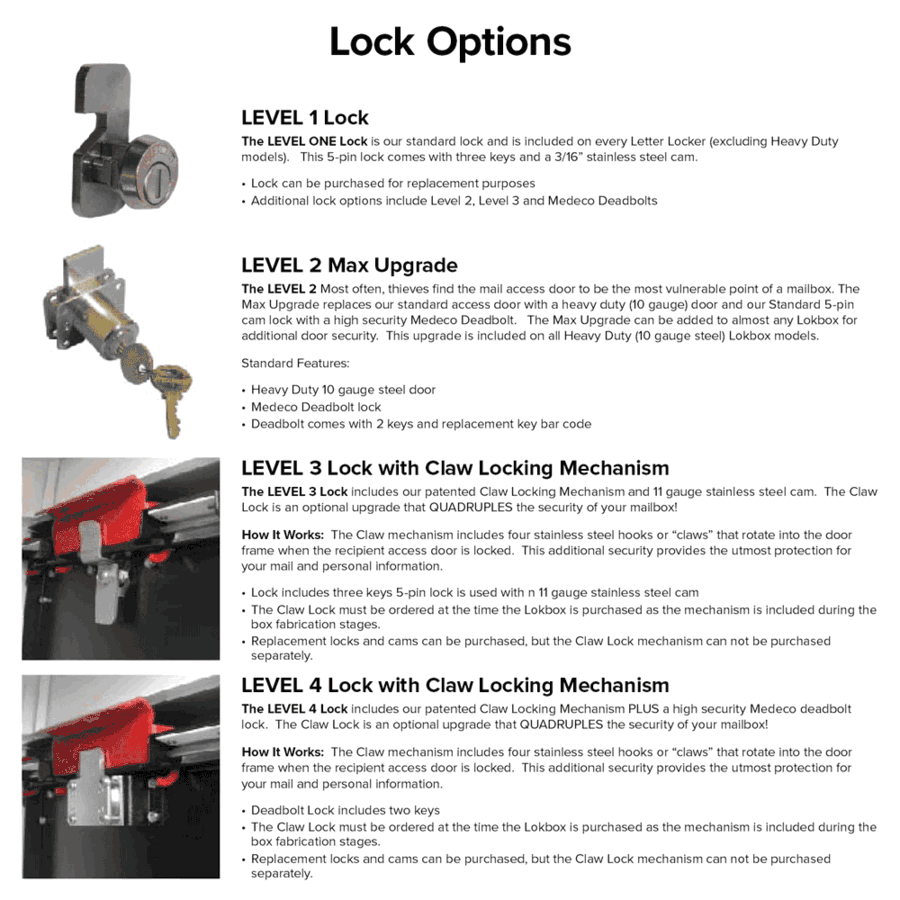 The Ultimate Lokbox has been built using a rotating hopper door so unwanted hands and/or objects can not access mail. With a large incoming slot, this box accepts large envelopes and small packages. An outgoing mail pocket is conveniently placed on the backside of the top door. Recipients access mail using a retrieval door located in either the front or back of the box.